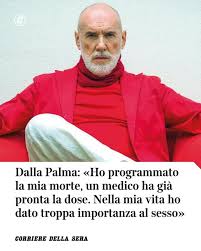 Da questa notizia ad un’altra solo qualche giorno. Diego Dalla Palma, 74 anni, profeta del make-up e figura iconica della cultura estetica italiana: “Ho programmato la mia morte…E se devo essere sincero, ho già organizzato tutto. Con un avvocato e un notaio”. Dalla Palma racconta la fatica del corpo che invecchia: “Alzarmi al cinema o a teatro è diventata una piccola umiliazione. Devo cambiare le mutande due volte al giorno. La mente non è più quella di prima. È vita questa?”. E aggiunge: “Ho salvato i miei genitori dalla miseria, per quanto potevo. Ma io come affronto il finale? Ho quattro soldi che mi permetteranno qualche sorriso, ma la vittoria sarà solo se potrò andarmene a modo mio”.