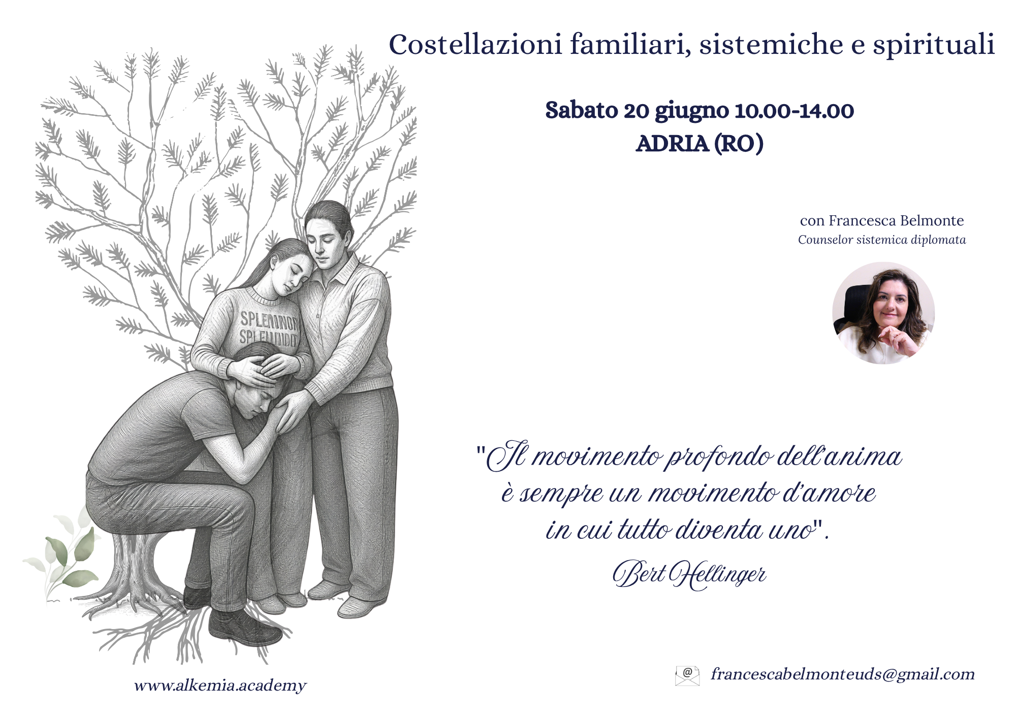 Le Costellazioni sono un aiuto alla vita, un servizio alla riconciliazione, un metodo di indagine, osservazione e presa di coscienza delle dinamiche profonde e dei disordini sistemici all’interno della famiglia e nelle varie relazioni. Bert Hellinger ci ha mostrato una verità semplice e rivoluzionaria: l’individuo non può essere compreso se non all’interno dei sistemi a cui appartiene. Il primo, e più potente, è la famiglia. Ogni sistema, ogni legame umano, è governato da ordini invisibili che regolano la vita e ne mantengono l’equilibrio. Quando questi ordini vengono rispettati, l’amore può scorrere libero. Quando vengono violati, l’amore si arresta, si congela e diventa un legame che trattiene, che lega, che impedisce all’individuo di fiorire. Tutte queste informazioni vengono trasmesse dagli antenati ai discendenti tramite il campo di coscienza e per riequilibrare le relazioni conflittuali dell’individuo e vivere al meglio, è necessario ricomporre gli Ordini dell’Amore, leggi che regolano l’esistenza di ogni individuo all’interno del proprio sistema familiare. La stessa fisica quantistica evidenzia che nulla è separato: siamo sistemi interconnessi, campi di informazione che si influenzano reciprocamente. Ciò che accade a uno risuona nel tutto. E le costellazioni parlano proprio questo linguaggio: connessioni invisibili, memorie transgenerazionali, ordini nascosti che regolano i sistemi umani, così come leggi universali che regolano l’universo. Quando si comprende di essere parte di un tutto, non si può più fingere di non vendere.